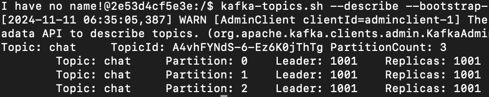 @KafkaListener(groupId = "chat-group", topicPartitions = @TopicPartition(topic = "chat", partitions = {"0"})) public void consumeMessagePartition0(ChatMessage chatMessage) { consumeMessage(chatMessage, 0); } @KafkaListener(groupId = "chat-group", topicPartitions = @TopicPartition(topic = "chat", partitions = {"1"})) public void consumeMessagePartition1(ChatMessage chatMessage) { consumeMessage(chatMessage, 1); } @KafkaListener(groupId = "chat-group", topicPartitions = @TopicPartition(topic = "chat", partitions = {"2"})) public void consumeMessagePartition2(ChatMessage chatMessage) { consumeMessage(chatMessage, 2); } private void consumeMessage(ChatMessage chatMessage, int partition) { try { simpMessagingTemplate.convertAndSend("/sub/chat/"+chatMessage.getChatRoomId().toString(), chatMessage); log.info("Received message from partition {}: {}", partition, chatMessage); } catch (Exception e) { log.error("Failed to process message from partition {}: {}", partition, chatMessage, e); } }테스트를 위해 처리한 파티션과 메세지를 남기는 로그를 찍었습니다...