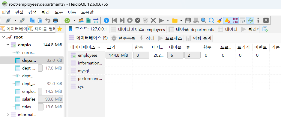 mariadb -u root -p MariaDB [(none)]> source employees.sql; MariaDB [(employees)]> show databases; MariaDB [employees]> show tables;> HeidiSQL: MariaDB 사용 시 기본으로 제공되는 GUI 환경