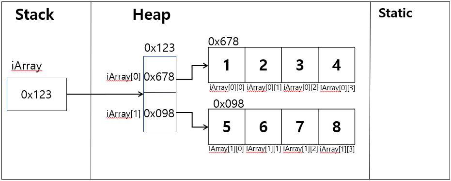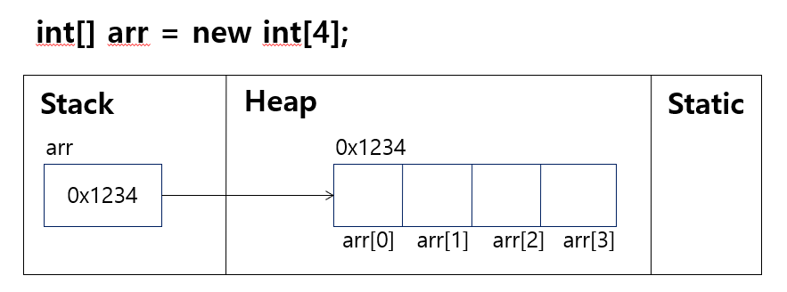 - 배열 변수는 참조 변수이다. 배열 변수는 Stack 영역에 생성된다.