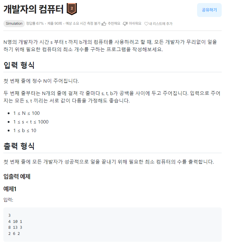 N명의 개발자가 시간 s 부터 t 까지 b개의 컴퓨터를 사용하려고 할 때, 모든 개발자가 무리없이 일을 하기 위해 필요한 컴퓨터의 최소 개수를 구하는 프로그램을 작성해보세요.