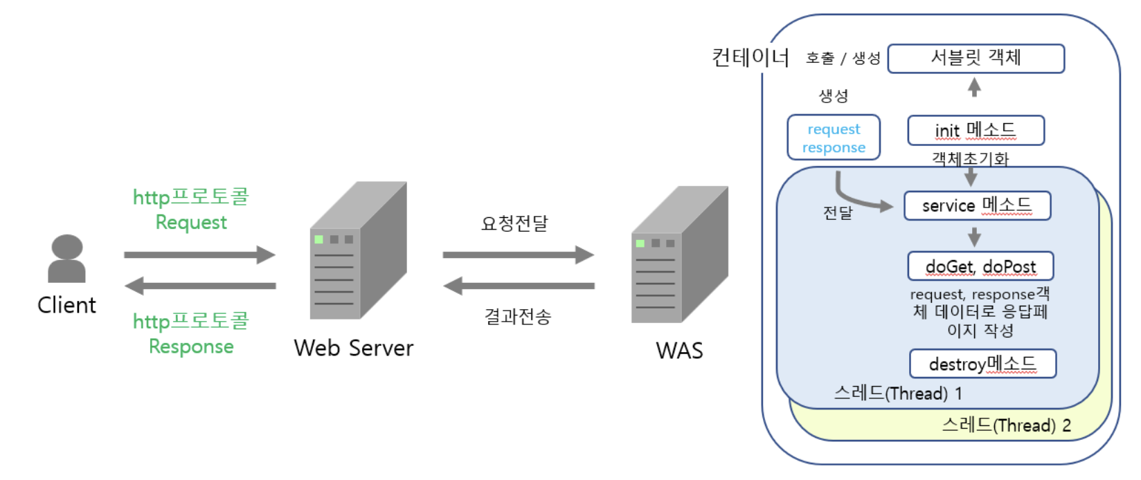 - 서블릿에서 요청에 대한 실행이 완료된 후에는 서블릿 컨테이너가 실행 결과를 웹서버에 전달한다.