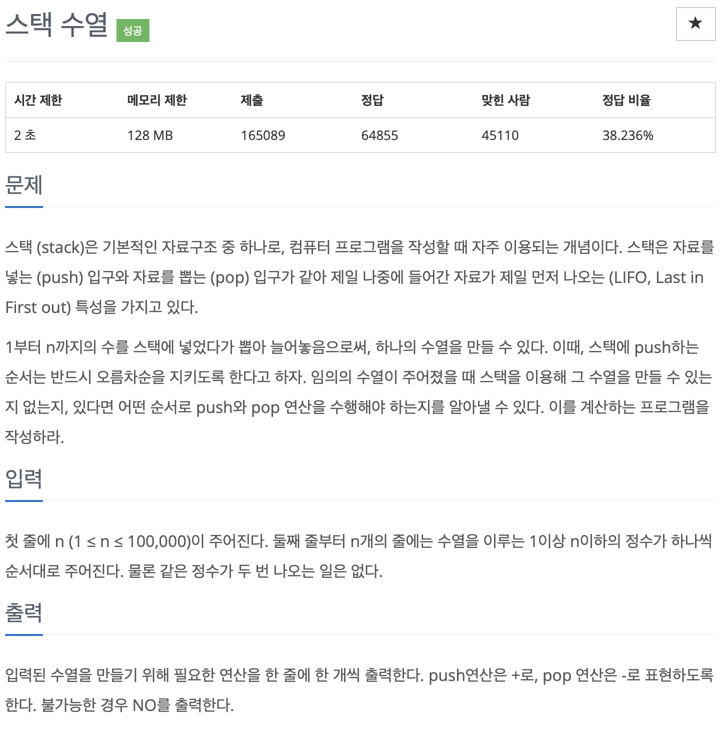입력된 수열을 만들기 위해 필요한 연산을 한 줄에 한 개씩 출력한다. push연산은 +로, pop 연산은 -로 표현하도록 한다. 불가능한 경우 NO를 출력한다.