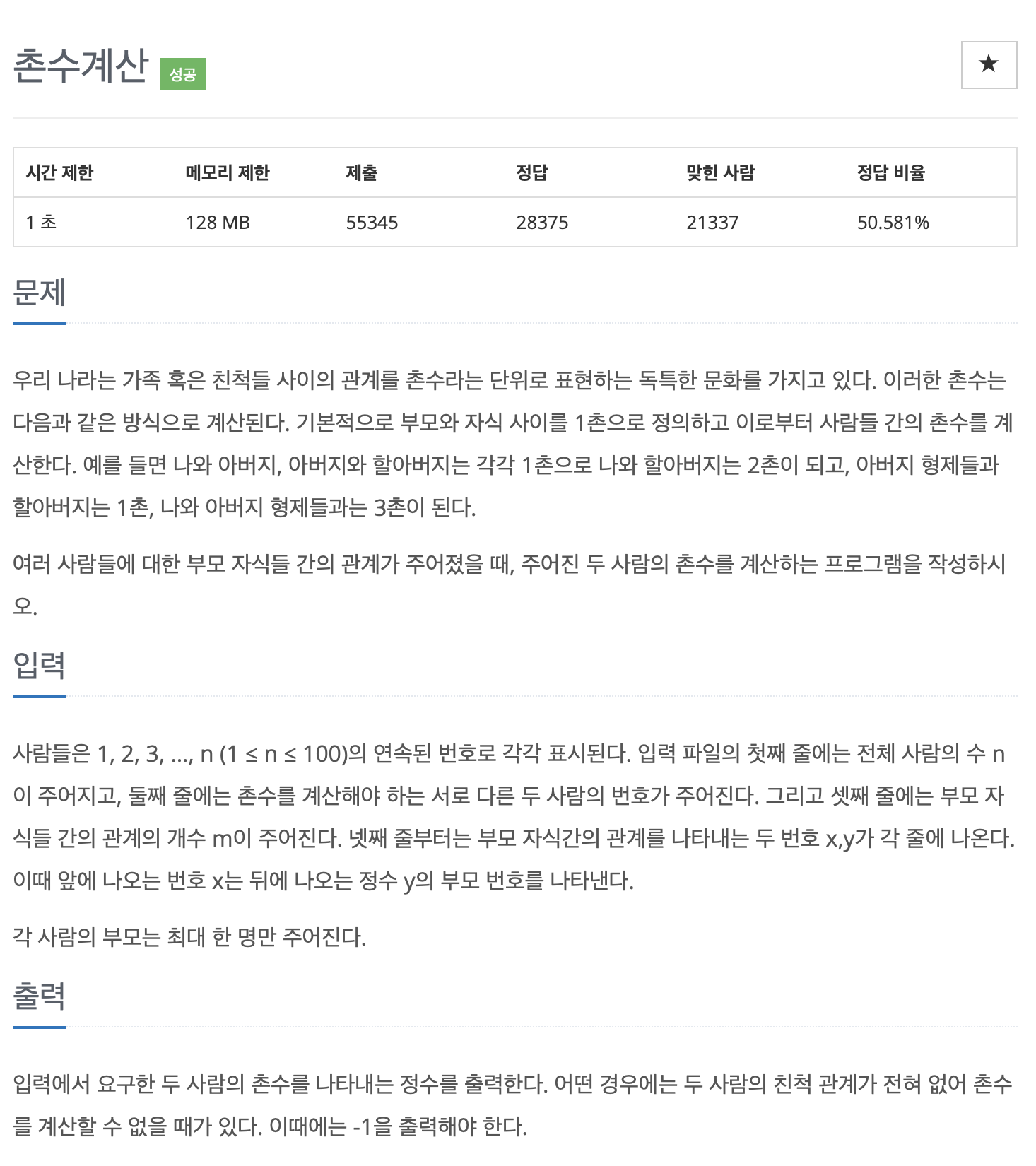 우리 나라는 가족 혹은 친척들 사이의 관계를 촌수라는 단위로 표현하는 독특한 문화를 가지고 있다. 이러한 촌수는 다음과 같은 방식으로 계산된다. 기본적으로 부모와 자식 사이를 1촌으로 정의하고 이로부터 사람들 간의 촌수를 계산한다. 예를 들면 나와 아버지, 아버지와 할아버지는 각각 1촌으로 나와 할아버지는 2촌이 되고, 아버지 형제들과 할아버지는 1촌, 나와 아버지 형제들과는 3촌이 된다.