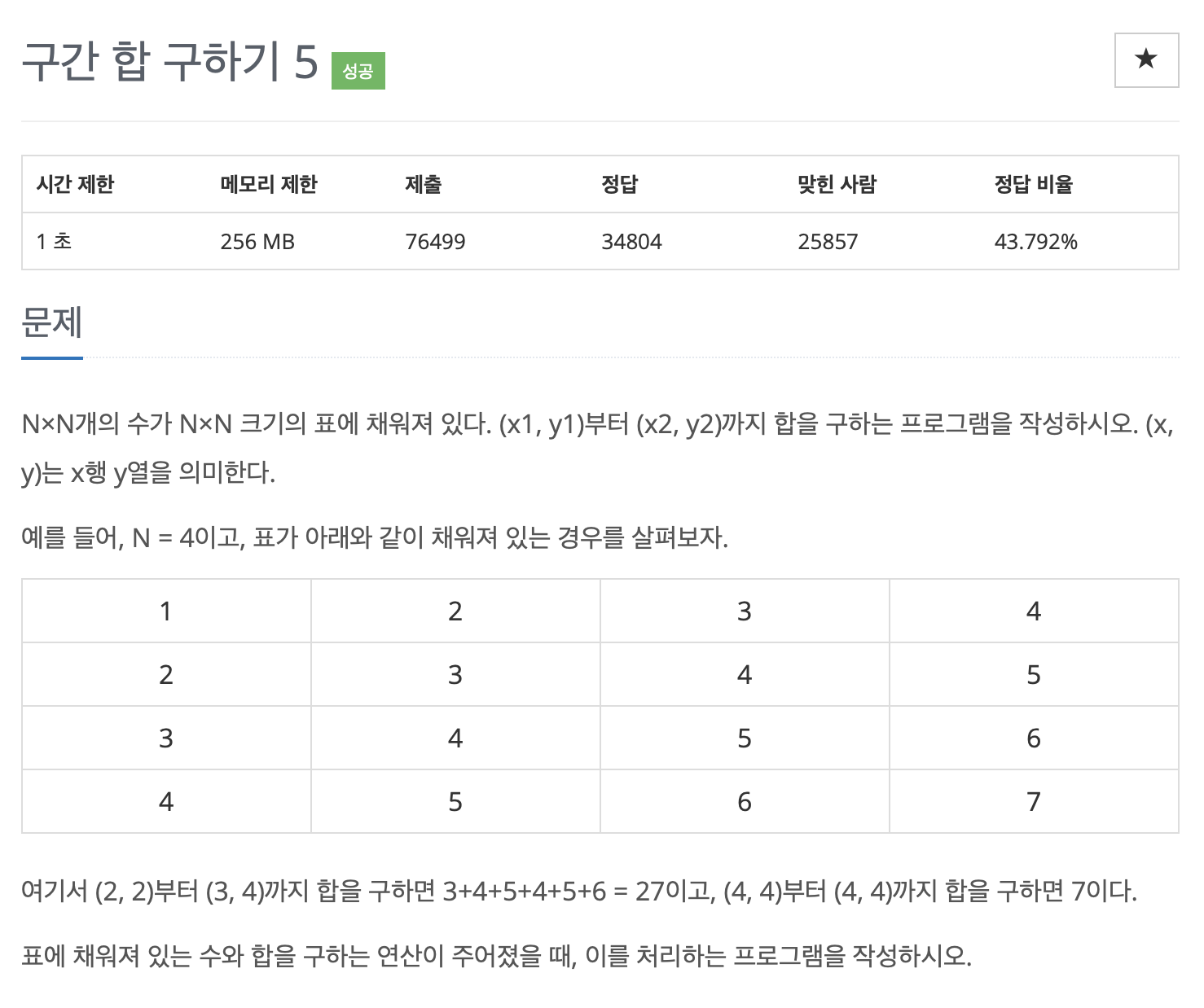 N×N개의 수가 N×N 크기의 표에 채워져 있다. (x1, y1)부터 (x2, y2)까지 합을 구하는 프로그램을 작성하시오. (x, y)는 x행 y열을 의미한다.