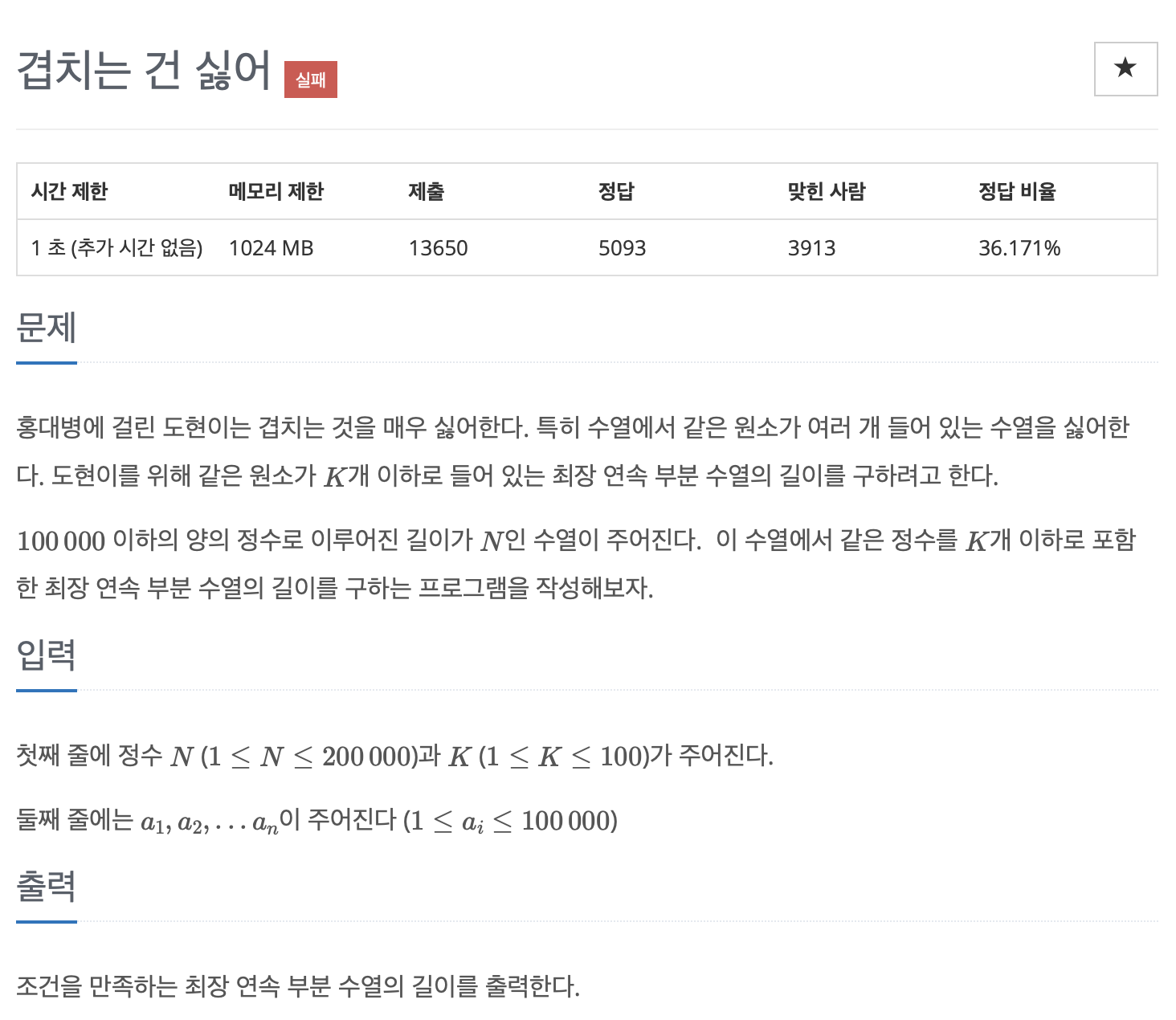 $100\,000$ 이하의 양의 정수로 이루어진 길이가 $N$인 수열이 주어진다. 이 수열에서 같은 정수를 $K$개 이하로 포함한 최장 연속 부분 수열의 길이를 구하는 프로그램을 작성해보자.