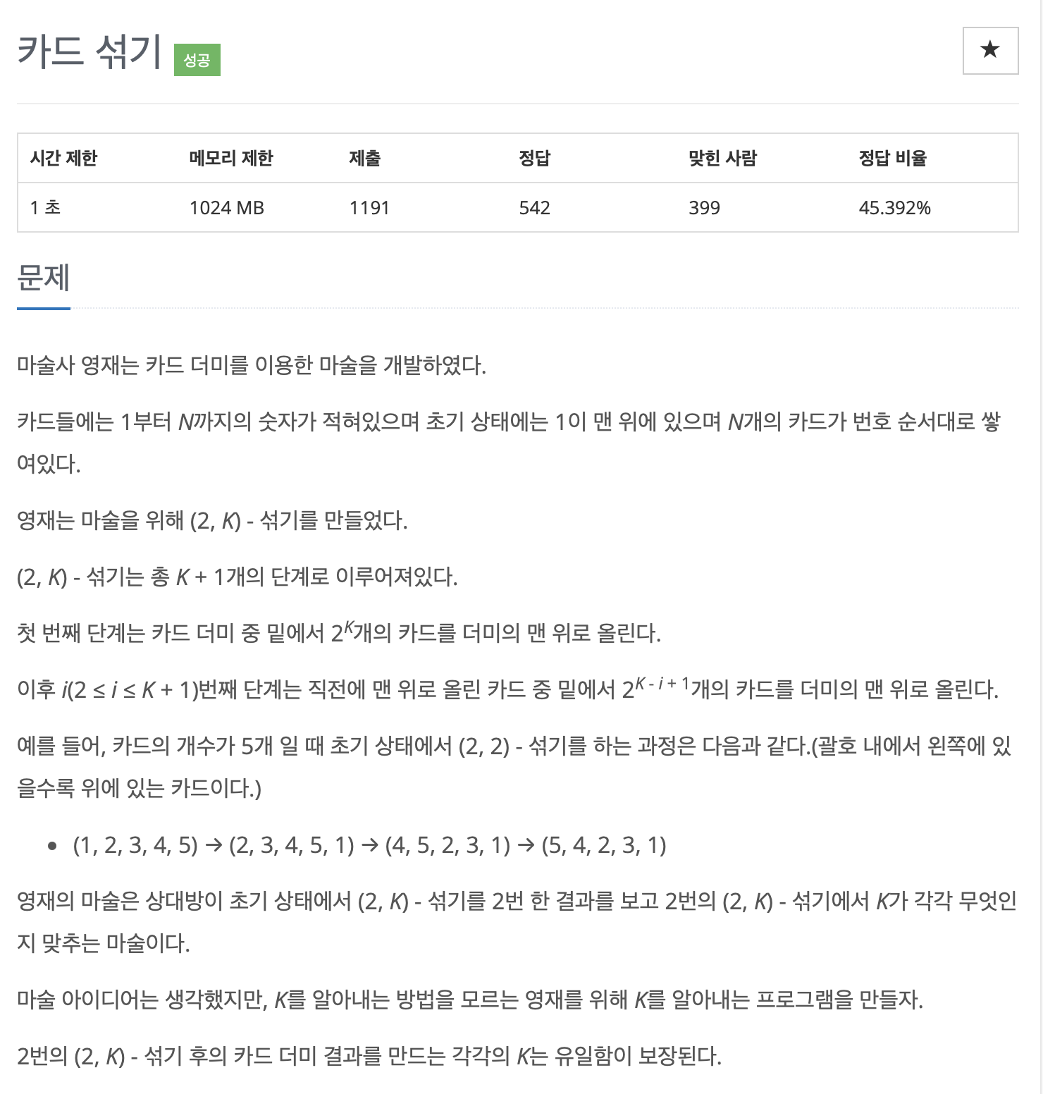 2번의 (2, K) - 섞기 후의 카드 더미 결과를 만드는 각각의 K는 유일함이 보장된다.