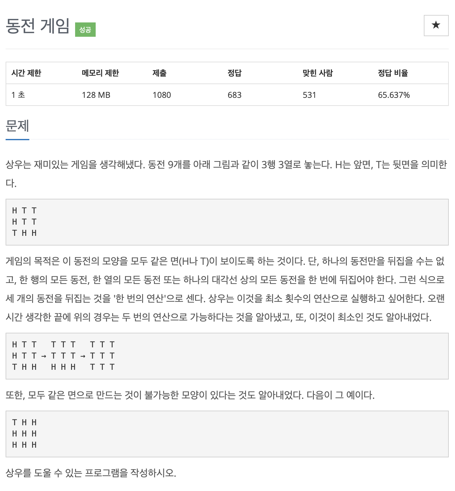 게임의 목적은 이 동전의 모양을 모두 같은 면(H나 T)이 보이도록 하는 것이다. 단, 하나의 동전만을 뒤집을 수는 없고, 한 행의 모든 동전, 한 열의 모든 동전 또는 하나의 대각선 상의 모든 동전을 한 번에 뒤집어야 한다. 그런 식으로 세 개의 동전을 뒤집는 것을 '한 번의 연산'으로 센다. 상우는 이것을 최소 횟수의 연산으로 실행하고 싶어한다. 오랜 시간 생각한 끝에 위의 경우는 두 번의 연산으로 가능하다는 것을 알아냈고, 또, 이것이 최소인 것도 알아내었다.